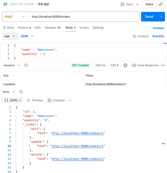 다시 돌아와서 응답 성공의 예시를 보면 다음과 같다. Header에 Location_links로 HATEOAS가 제공되는 것을 확인할 수 있다.