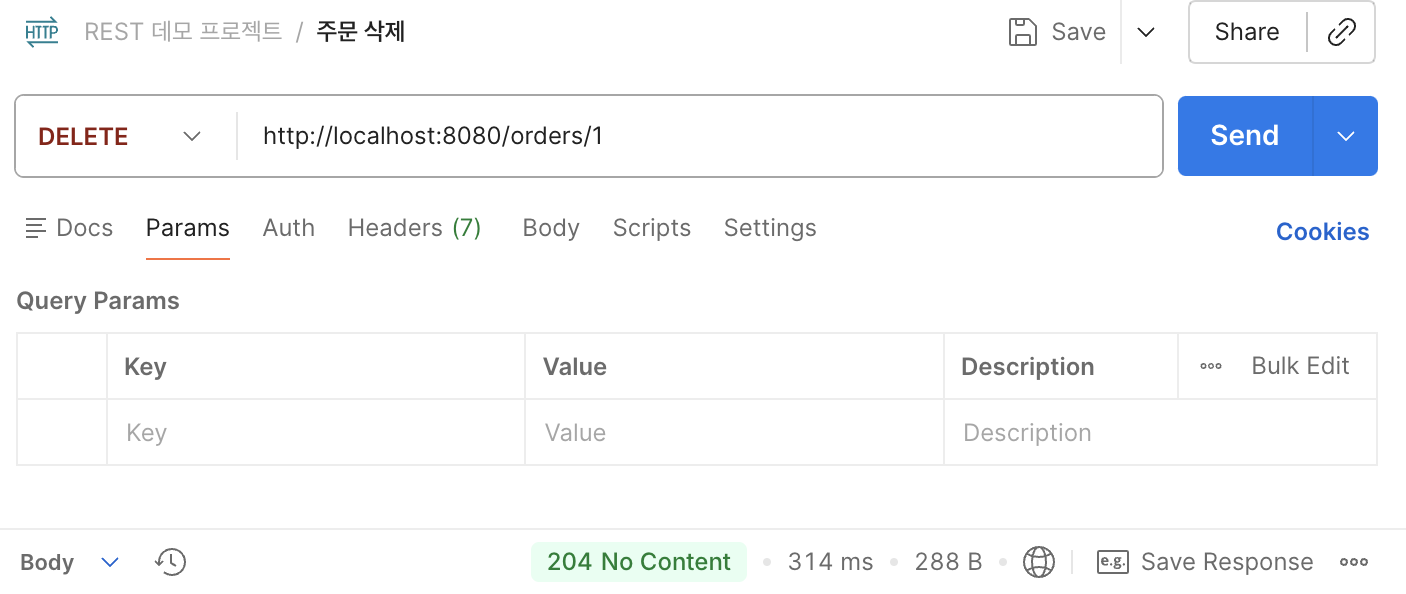 주문 삭제 API는 DELETE /orders/{orderId}로 정의한다. 삭제 성공 시에는 마찬가지로 **204 No Content**를 반환한다.
