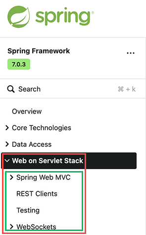 먼저 Spring 프레임워크 공식 문서를 확인해보면, 웹과 관련된 내용은 Web on Servlet Stack이라는 섹션 아래에 정리되어 있다.