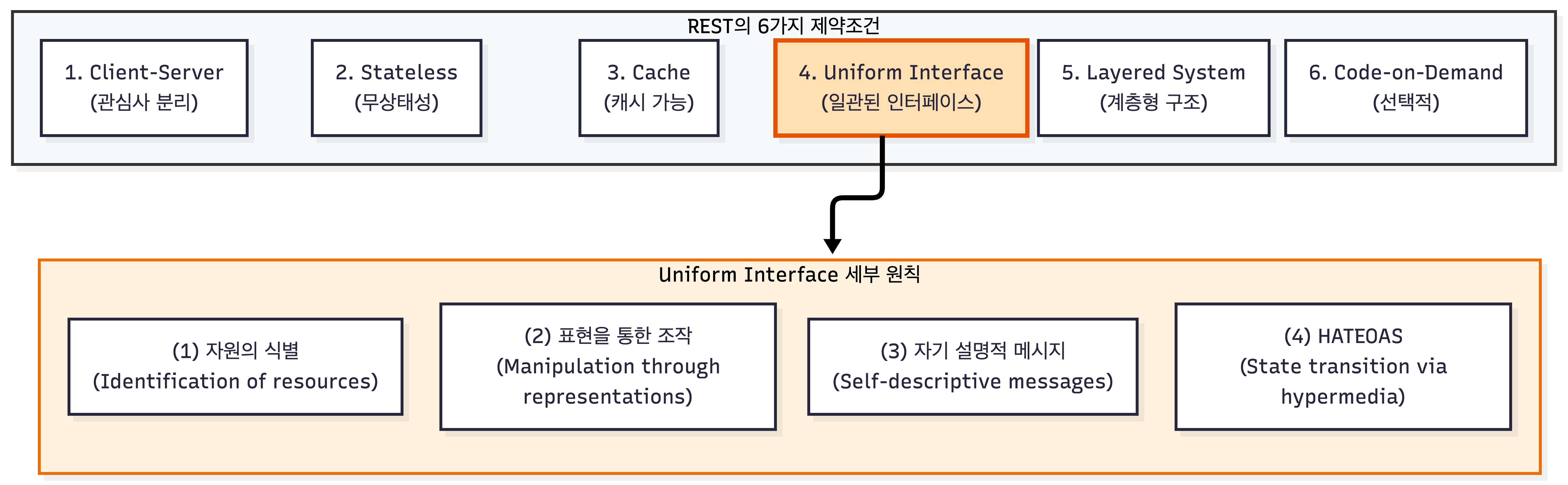 이전 내용을 잠시 Recap하자면, 다음과 같다. REST의 6가지 제약 조건 (1) Client-Server: 클라이언트와 서버를 분리한다. (2) Stateless: 서버는 클라이언트의 상태를 저장하지 않는다. (3) Cache: 응답은 캐시가 가능하며, 캐시 가능 여부를 명시해야 한다. (4) Uniform Interface: 일관된 인터페이스를 가진다. ├─(4.1) Identification of resource: 모든 자원은 URI로 구분된다. ├─(4.2) Manipulation through representations: 클라이언트는 자원의 표현을 통해 자원을 다룬다. ├─(4.3) Self-descriptive messages: 메시지 자체만으로 처리 의미를 해석할 수 있다. └─(4.4) HATEOAS: 응답에 상태 전이를 위한 링크를 포함할 수 있다. (5) Layered System: 시스템은 여러 계층으로 구성 될 수 있다. (6) Code-on-Demand (optional): 서버가 클라이언트에 실행 가능한 코드를 전달할 수 있다..