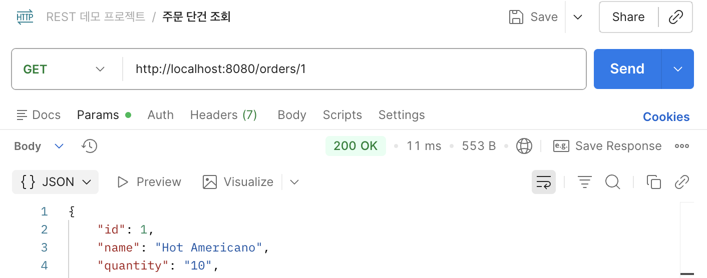 주문 단건 조회 API는 GET /orders/{orderId}로 정의하며, 요청이 성공적으로 처리되면 200 OK 상태 코드와 함께 해당 주문 자원의 표현을 반환한다.