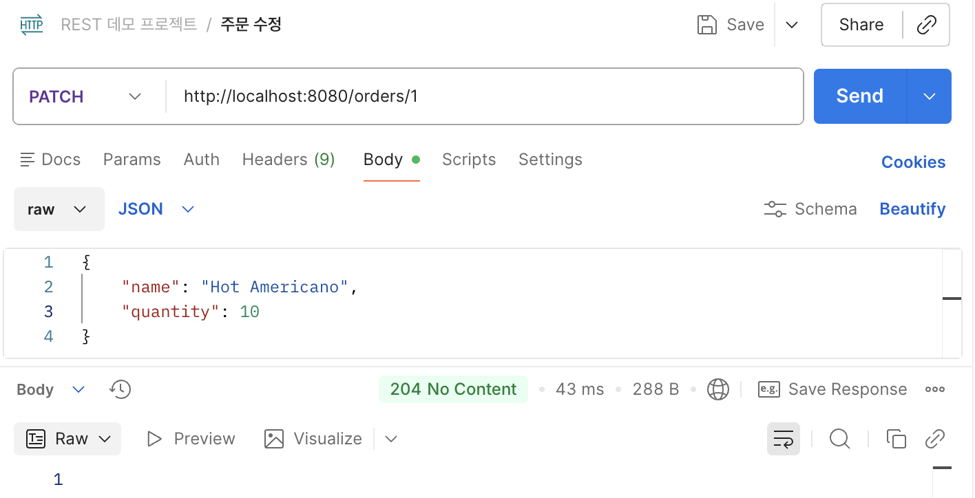 주문 수정 API는 PATCH /orders/{orderId}로 정의한다. 이번 demo에서는 수정 성공 시, 응답 본문을 반환하지 않는 방식으로 단순화하여, 204 No Content 상태 코드를 사용한다.